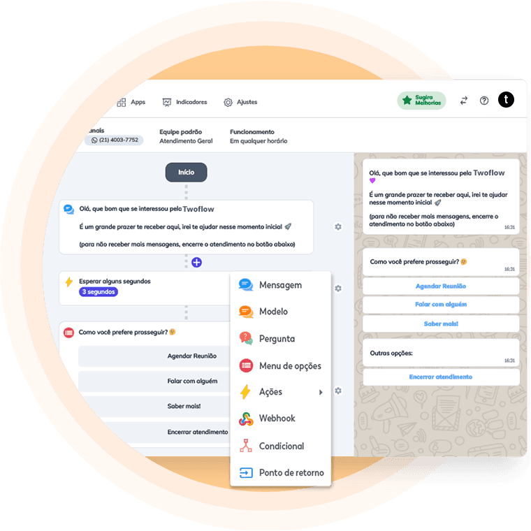 Configure robôs de atendimento que fazem sentido para sua empresa. Alie o atendimento automatizado com o humano, de acordo com a sua necessidade.